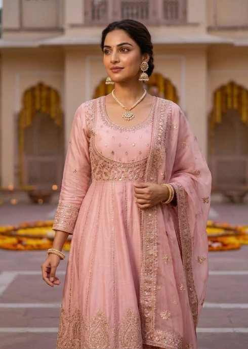 Kharatis Blush Pink Pure Organza Embroidered Suit Set – Pearl & Dabka Work