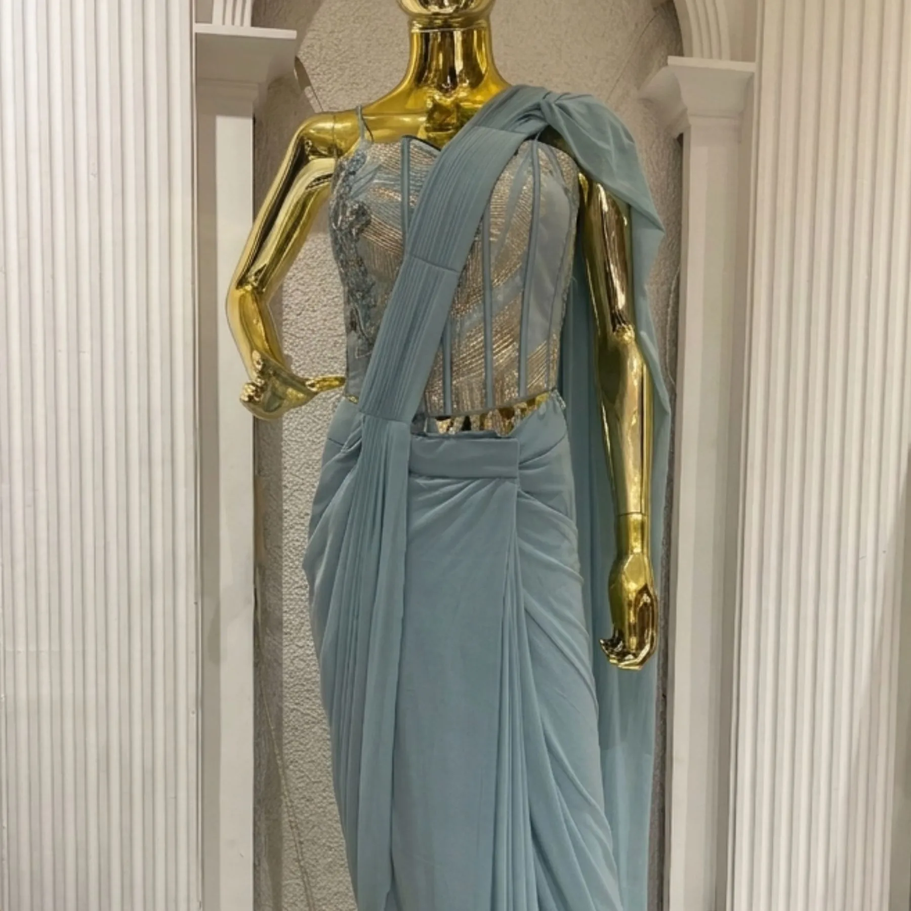 Step into timeless elegance with this exclusive Kharatis powder blue draped saree co-ord set, designed for women who love a blend of modern sophistication and traditional charm. This luxurious ensemble features a structured corset-style blouse with intricate embroidery, paired with a fluid, pre-draped saree that enhances your silhouette effortlessly.